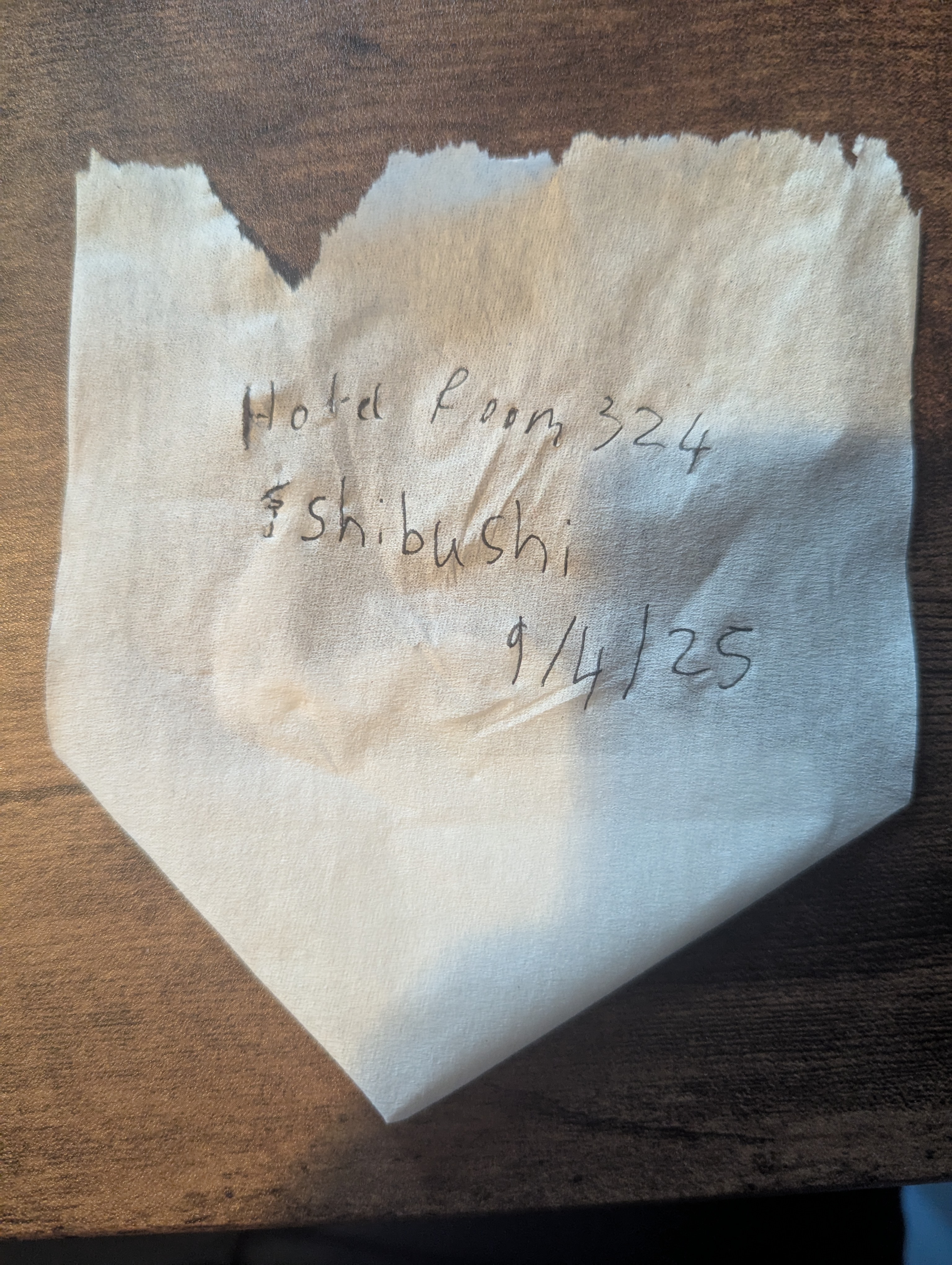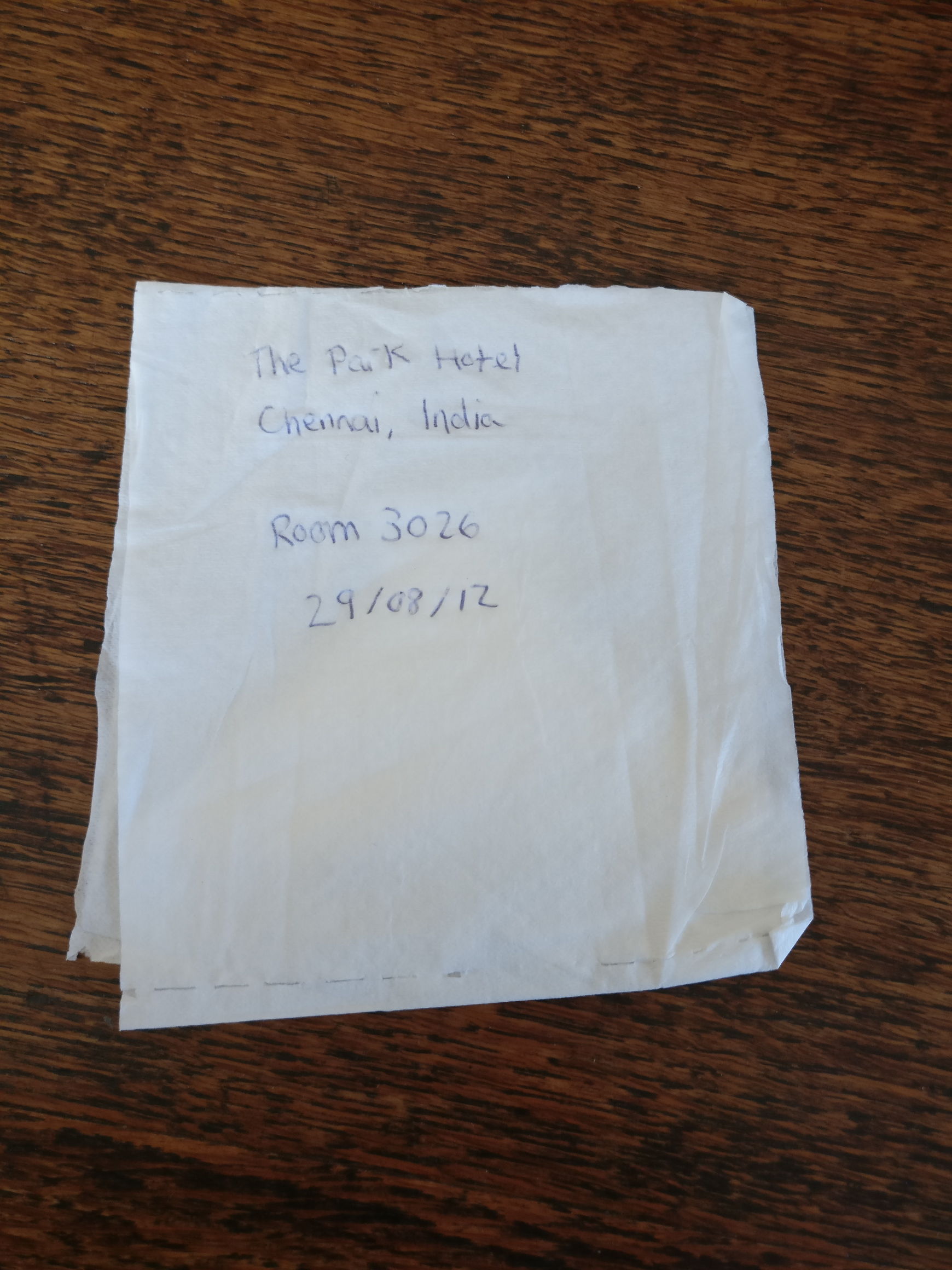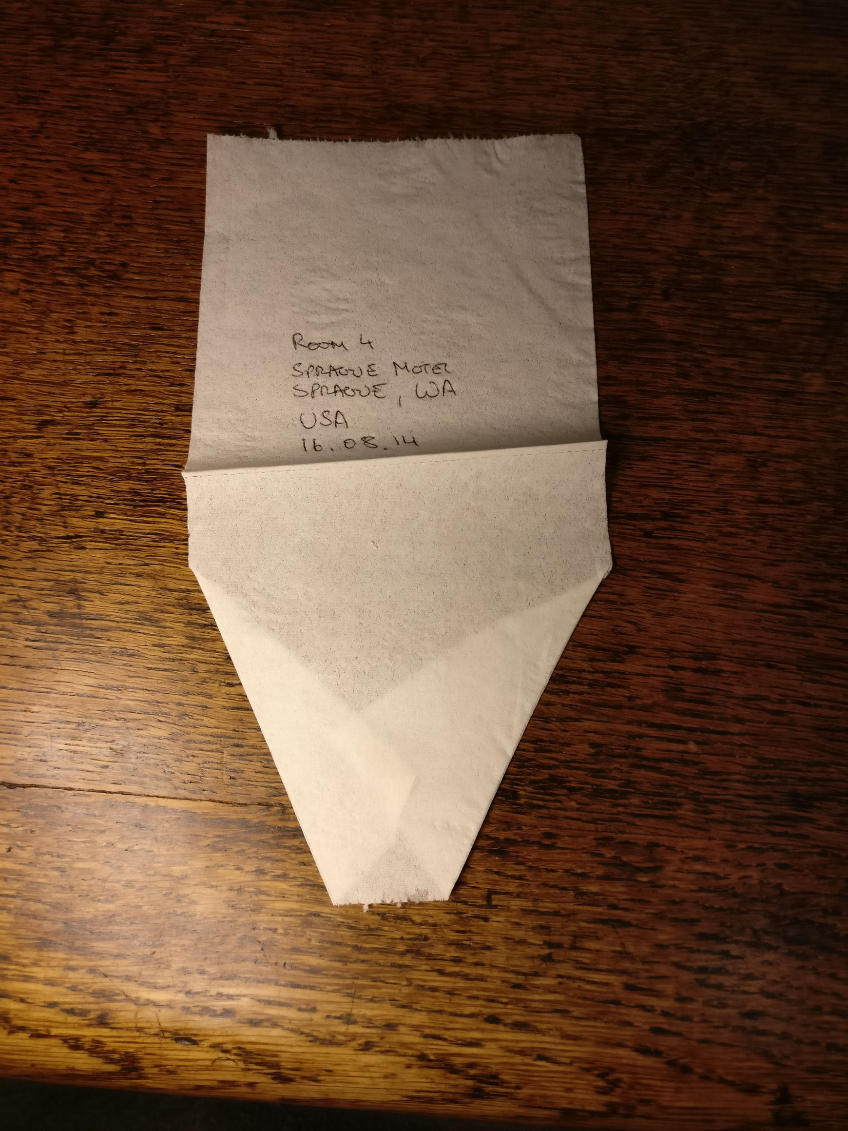 Over the next three years, I carefully ripped off and collected the folded papers I found in all the hotels I stayed in, from Spain to Canada, New York City to Japan, Britain to Romania. I’d place them between the pages of a book (taking care to preserve the folded edge), carry them back to my London studio and keep them in a box. Then I laid them out on a sheet of dark-grey card, and took photographs, using the same camera and light source each time. Each picture is almost exactly the same, but that very uniformity seems to emphasise the subtle differences between them.